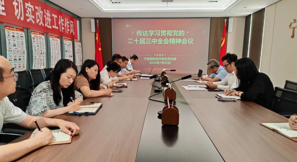 7月22日,寧夏國投資本聯(lián)合黨支部召開會議,傳達學習黨的二十屆三中全會精神,抓好全會精神的學習宣傳貫徹工作,推動全面深化改革落實。公司總經(jīng)理領(lǐng)讀領(lǐng)學《中國共產(chǎn)黨第二十屆中央委員會第三次全體會議公報》,并提出落實意見。黨支部全體黨員及職工群眾參加集體學習。