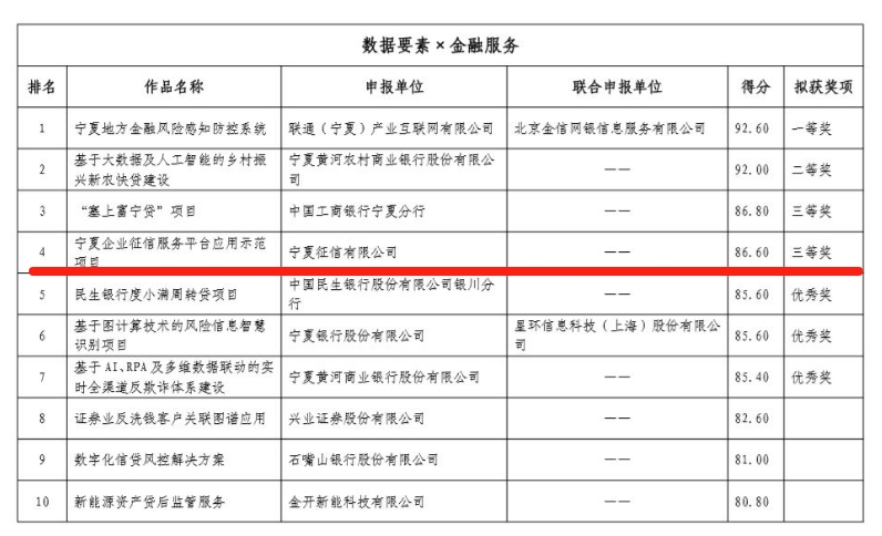近期,由國家數(shù)據(jù)局、自治區(qū)人民政府指導(dǎo),自治區(qū)發(fā)展改革委(數(shù)據(jù)局)、自治區(qū)數(shù)據(jù)中心共同主辦的2024年“數(shù)據(jù)要素×”大賽寧夏區(qū)分賽,吸引超過千人報名參賽,參賽作品涵蓋工業(yè)制造、現(xiàn)代農(nóng)業(yè)、金融服務(wù)等6個行業(yè)賽道和1個通用賽道,經(jīng)過初賽、技術(shù)驗證、決賽等環(huán)節(jié),寧夏征信公司(寧夏國投集團下屬企業(yè))報送的參賽作品“寧夏企業(yè)征信服務(wù)平臺應(yīng)用示范項目”從280多個參賽作品中脫穎而出,最終在以銀行、證券等金融機構(gòu)為主的金融服務(wù)賽道獲得了寧夏賽區(qū)決賽三等獎的好成績,評審組專家一致認(rèn)為該項目具有可復(fù)制、可推廣運用的重要價值。