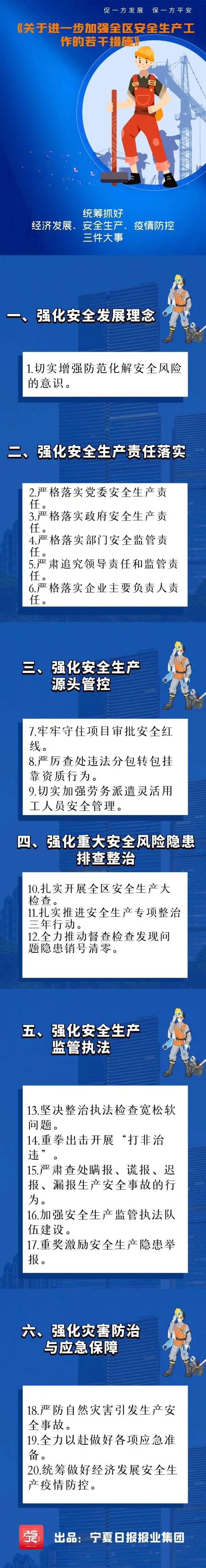 為進(jìn)一步加強(qiáng)全區(qū)安全生產(chǎn)工作,消除安全風(fēng)險隱患,有效防范遏制重特大生產(chǎn)安全事故發(fā)生,保持社會大局穩(wěn)定,日前寧夏印發(fā)《關(guān)于進(jìn)一步加強(qiáng)全區(qū)安全生產(chǎn)工作的若干措施》的通知(以下簡稱《通知》)?!锻ㄖ反_定了二十項加強(qiáng)安全生產(chǎn)工作的硬措施,為統(tǒng)籌抓好我區(qū)經(jīng)濟(jì)發(fā)展、安全生產(chǎn)、疫情防控三件大事提供有效保障。