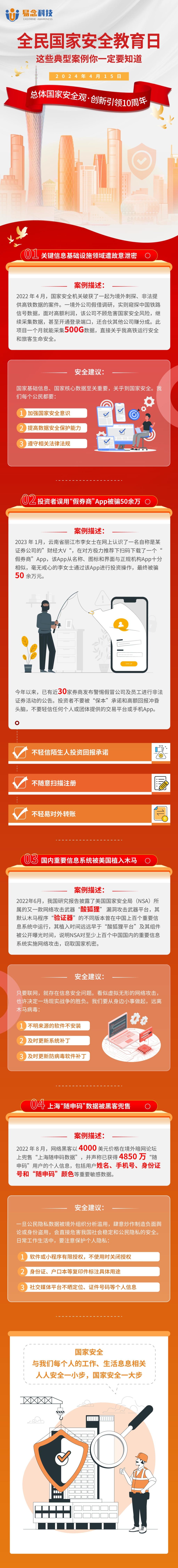 國(guó)家安全教育至關(guān)重要,黨的二十大報(bào)告指出要:“全面加強(qiáng)國(guó)家安全教育,提高各級(jí)領(lǐng)導(dǎo)干部統(tǒng)籌發(fā)展和安全能力,增強(qiáng)全民國(guó)家安全意識(shí)和素養(yǎng),筑牢國(guó)家安全人民防線(xiàn)?!苯衲耆駠?guó)家安全教育日的主題為“總體國(guó)家安全觀·創(chuàng)新引領(lǐng)10周年”。