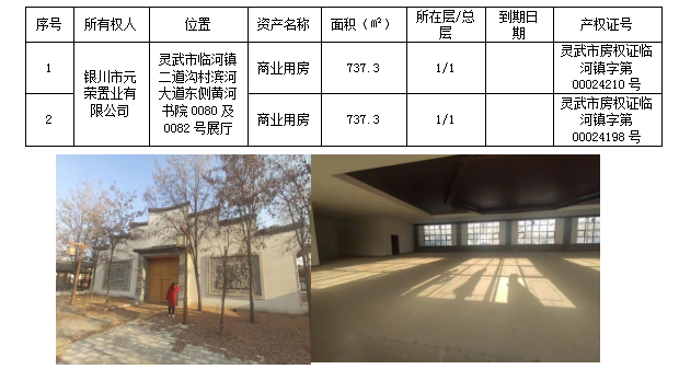 該戶債權(quán)抵押物位于靈武市臨河鎮(zhèn)濱河大道東側(cè)黃河書院內(nèi)0080號(hào)和0082號(hào)展廳,面積共計(jì)1474.6平方米。抵押物房屋戶型良好,寬敞明亮,有部分基礎(chǔ)裝修。該地理位置交通便利,距離銀川河?xùn)|國(guó)際機(jī)場(chǎng)約3公里。黃河書院集“文化傳播、學(xué)習(xí)靜修”為一體,環(huán)境優(yōu)美宜人,遠(yuǎn)離鬧市喧囂,適合經(jīng)營(yíng)飯店、旅游展廳等。