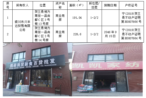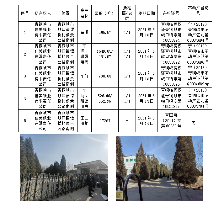該戶債權(quán)項(xiàng)下位于賀蘭縣朔方南街一品尚都的抵押物,周圍商業(yè)氛圍較好,目前兩套房產(chǎn)均有承租人;青銅峽市峽口鎮(zhèn)談橋村的土地和車間位于青銅峽市峽口鎮(zhèn)譚橋村侯余公路南側(cè),即青銅峽市佳美紙業(yè)有限責(zé)任公司廠區(qū),目前因債務(wù)人資金短缺,暫時處于停產(chǎn)、關(guān)閉狀態(tài)。
