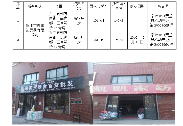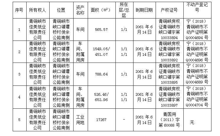 該戶債權(quán)項(xiàng)下位于賀蘭縣朔方南街一品尚都的抵押物,周圍商業(yè)氛圍較好,目前兩套房產(chǎn)均有承租人;青銅峽市峽口鎮(zhèn)談橋村的土地和車間位于青銅峽市峽口鎮(zhèn)譚橋村侯余公路南側(cè),即青銅峽市佳美紙業(yè)有限責(zé)任公司廠區(qū),目前因債務(wù)人資金短缺,暫時(shí)處于停產(chǎn)、關(guān)閉狀態(tài)。