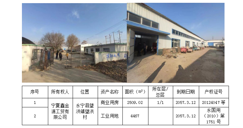 抵押物為寧夏鑫金源工貿(mào)公司名下位于永寧縣望洪鎮(zhèn)望洪村的工業(yè)用地和廠房,總建筑面積2509.02平米,占地面積4467平米,目前部分處于租賃狀態(tài),作為倉儲使用。