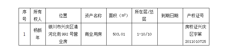 抵債資產(chǎn)為抵押人楊新年名下位于銀川市興慶區(qū)清和北街992號的營業(yè)房,面積503.01㎡,抵押物目前處于空置狀態(tài)。