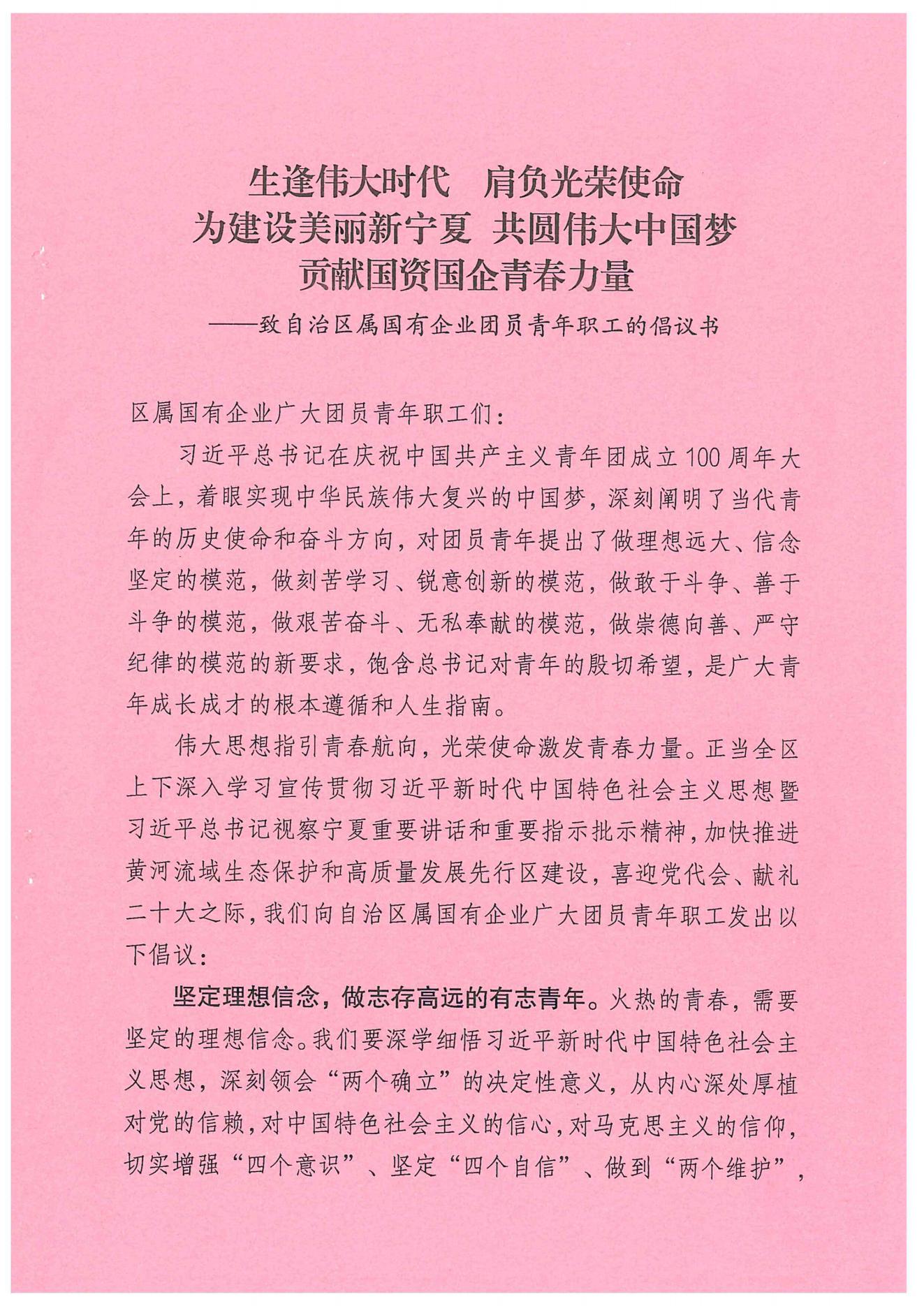 生逢偉大時(shí)代 肩負(fù)光榮使命 為建設(shè)美麗新寧夏 共圓偉大中國(guó)夢(mèng) 貢獻(xiàn)國(guó)資國(guó)企青春力量----致自治區(qū)屬?lài)?guó)有企業(yè)團(tuán)員青年職工的倡議書(shū)