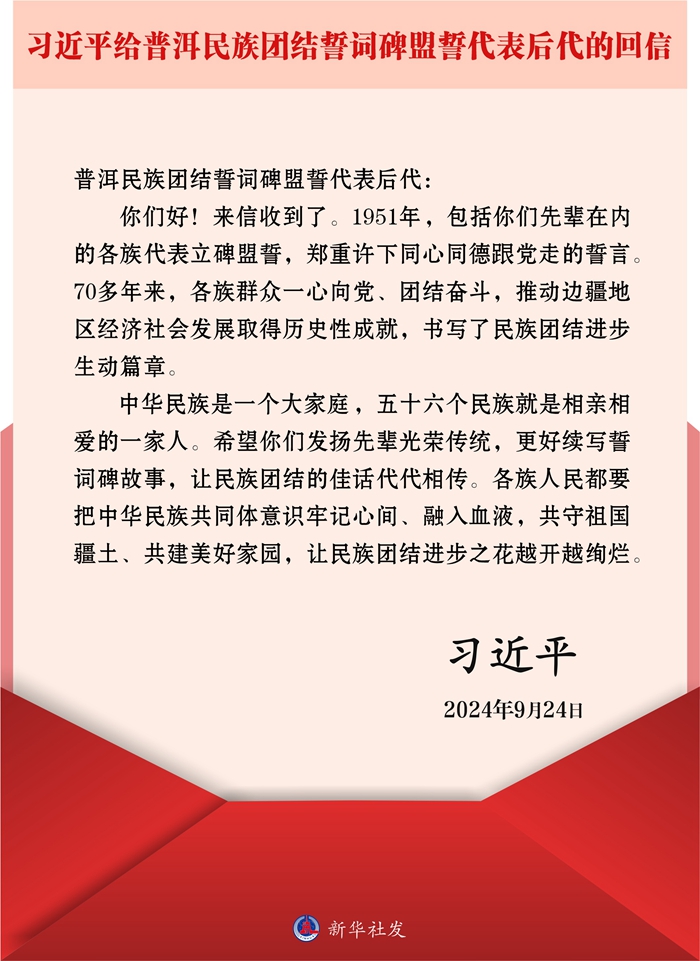 ??新華社北京9月25日電 近日,中共中央總書記、國家主席、中央軍委主席習(xí)近平給普洱民族團(tuán)結(jié)誓詞碑盟誓代表后代回信,對他們予以親切勉勵并提出殷切希望。