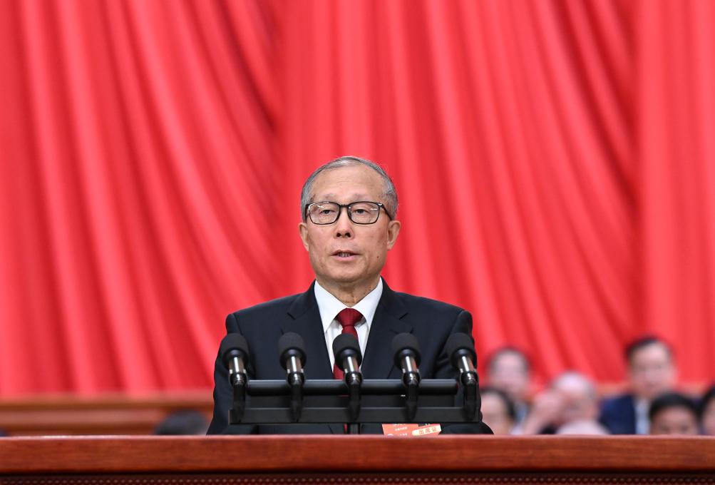 ??3月5日上午,第十四屆全國人民代表大會第三次會議在北京人民大會堂開幕。受全國人大常委會委托,全國人大常委會副委員長李鴻忠作關于全國人民代表大會和地方各級人民代表大會代表法修正草案的說明。新華社記者 張領 攝