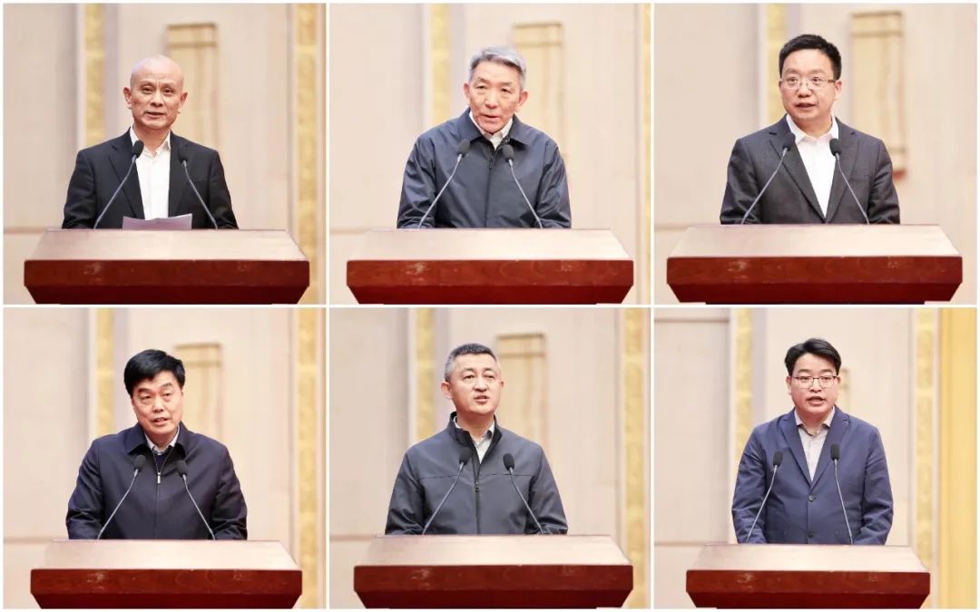 彭凡、郝向峰、曹建偉、汪世峰、莊寧5名企業(yè)家和商協(xié)會(huì)代表朱鳳杰(從左至右、從上至下)發(fā)言。